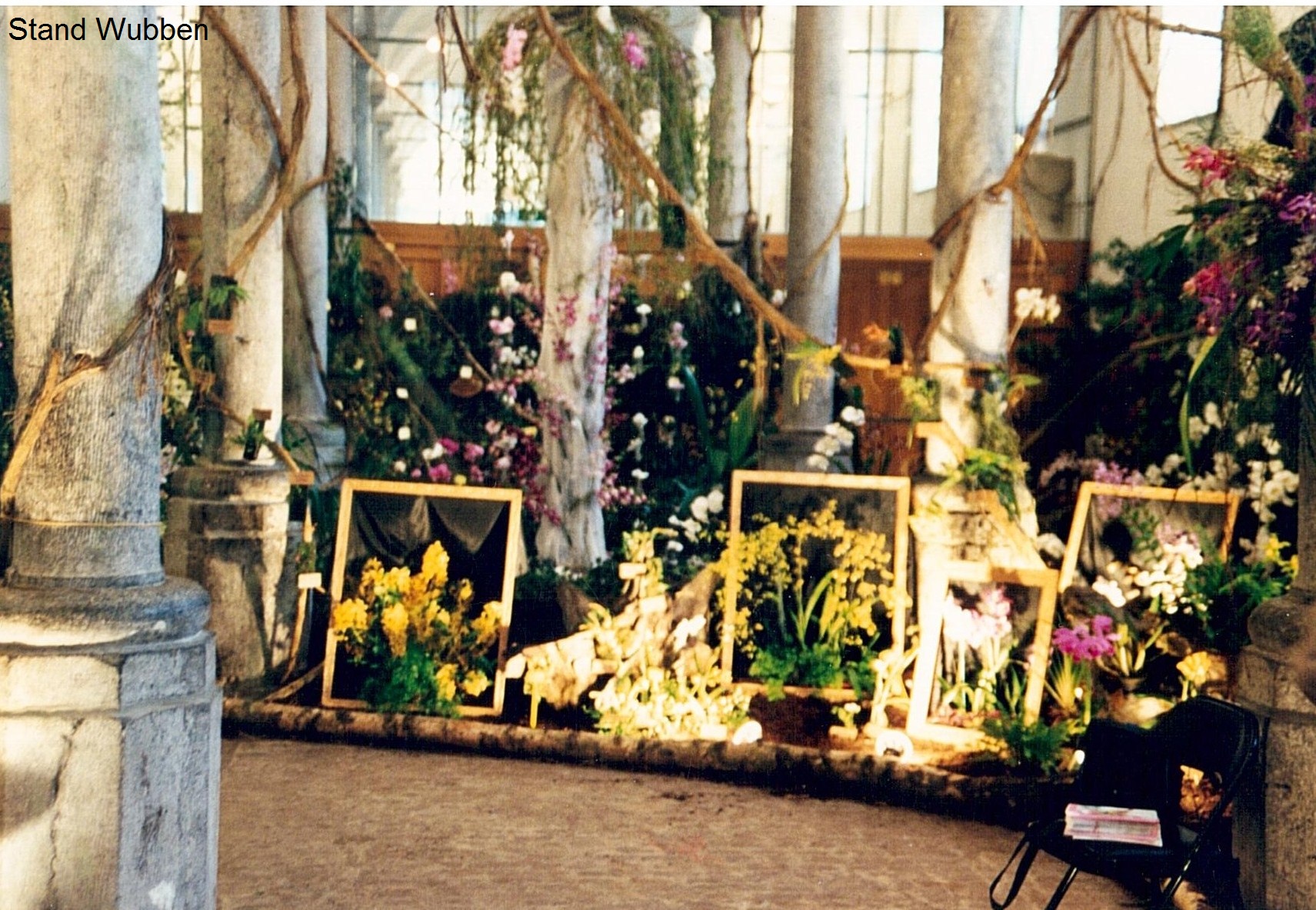 Les élèves des écoles d'horticulture qui ont réalisé l'environnement végétal des stands professionnels, ont installé leurs plantes au milieu de leur salle, les surmontant d'une énorme composition colorée.Dans un angle de l'entrée, un petit stand d'Orchideenvriend VZU de Gend fait face à une combinaison de gros Cymbidium clairs qui servent de décoration au podium.