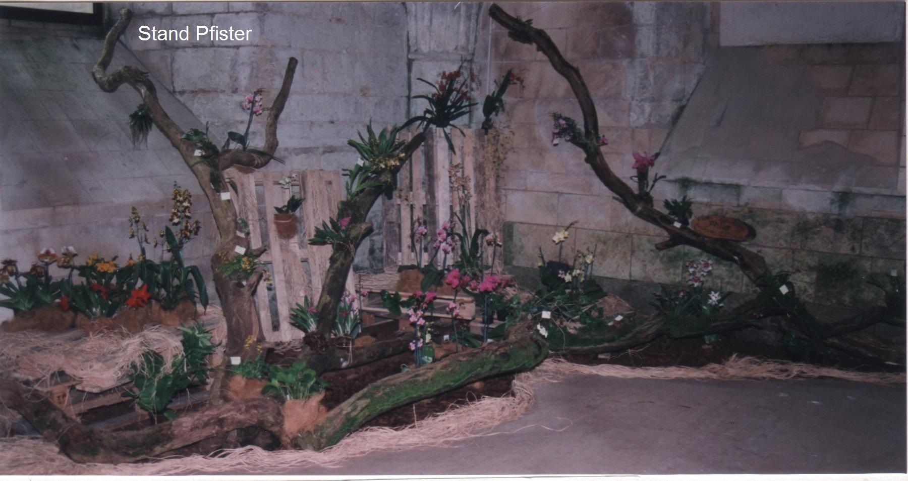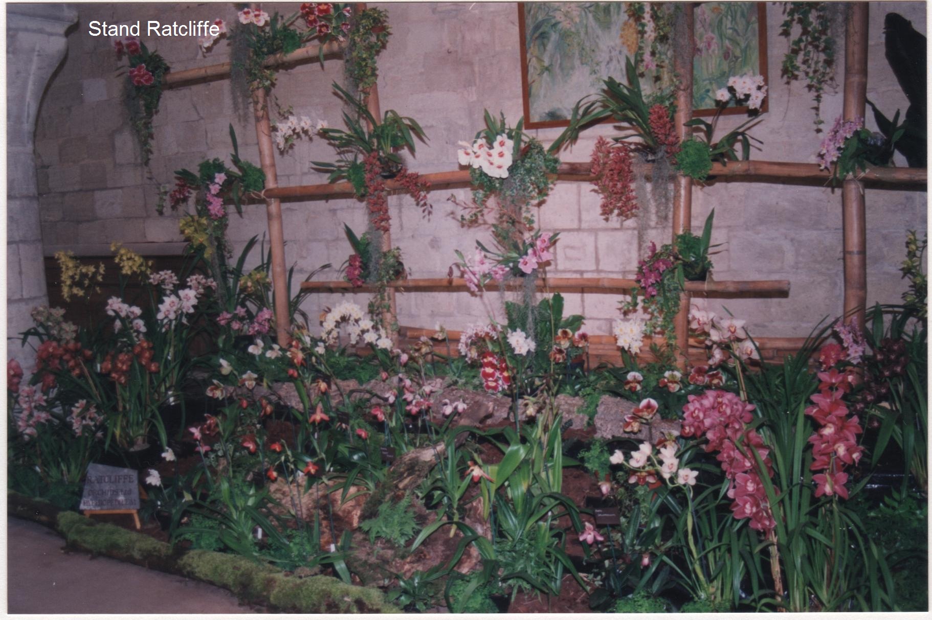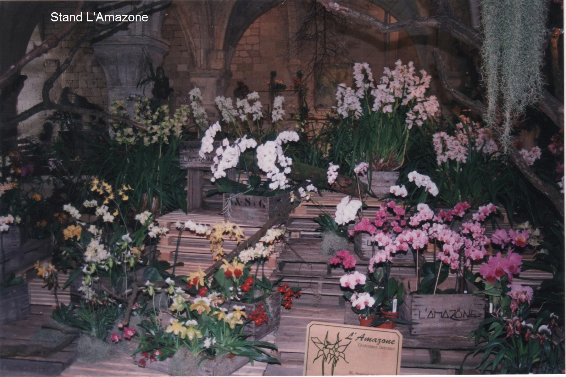 L’exposition elle-même se trouve dans la Salle des Moines dont la surface est de l’ordre de 800m2 et qui contient dix énormes piliers soutenant les voûtes. Elle est décorée cette année de toiles de grandes dimensions dues à Henriette Lecoufle : L'environnement de pierre et le grand espace leur conviennent parfaitement. Les deux salles voisines sont respectivement réservées aux stands de vente ainsi qu’à l’espace restauration, et à l'artisanat. • Présence d’un professionnel français : Marcel Lecoufle, et de cinq producteurs étrangers : Ratcliffe et Mac Beans (Sussex) de Grande Bretagne, '' L'Amazone'' de Charleroi en Belgique, Riboni de Varese en Italie, les établissements Flor Brasil (Maison Pfister) au Brésil ; de deux associations d’amateurs : ''Orchidees 59'' et un club belge ''Vlaamse Orchideeenvrienden'' et des Serres du Sénat, placées aussi dans la catégorie amateur parce qu'elles ne font pas de commerce. Comme l'a dit l'un des membres du jury on pourrait qualifier ces dernières d’'amateurs professionnels'', les autres étant alors des ''amateurs fous''.