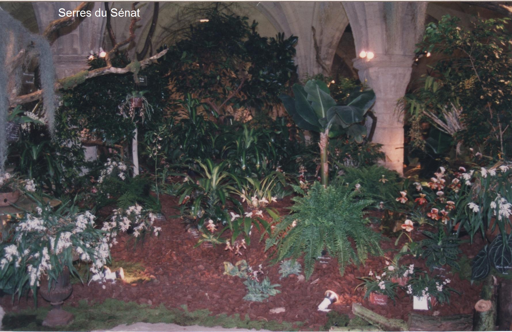 Droit devant en entrant, les Serres du Sénat occupent une surface d'environ 50m2 délimitée par quatre piliers. Pour occuper une telle superficie : des orchidées, des fougères et de grandes plantes vertes dont les feuilles très luisantes accrochent la lumière et nuisent un peu a la prestation des orchidées. A droite, le stand de Mac Beans est fait exclusivement de fleurs coupées (de longues hampes de Cymbidium en grande majorité) rassemblées par couleurs et se détachant sur des fonds de draperies légères. Au fond de la salle, toujours à droite, le stand de Marcel Lecoufle : un assez petit nombre de superbes plantes très bien mises en valeur dans un décor classique, réussi mais peu innovant. A gauche, le stand de Pfister parait un peu misérabiliste avec ses trois troncs secs et peu garnis.